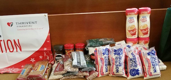 distributing groceries, coffee, sugar, creamer, rice, etc.